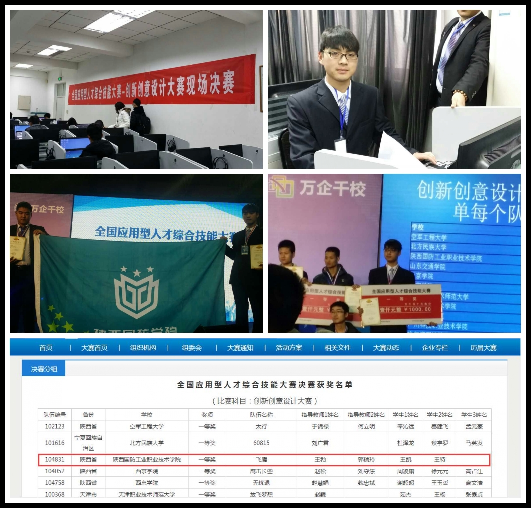 本届大赛从今年5月份开始在全国范围内开展,共设平面设计大赛、创新创意设计大赛、机械设计与综合技能大赛、教师创课课件大赛、大学生简历大赛、中国青春梦服装创意设计大赛、金蝶云管理创新杯大赛7个比赛科目。来自全国31个省、自治区、直辖市的近800所高校的7110支队伍参加了本次大赛。经过作品的初审,评选出615个优秀作品进入决赛。我院由王特、王凯两名同学组成的“飞鹰”参赛团队,参加了创新创意设计大赛。比赛经过了作品提交、初审、决赛以及现场答辩等多个阶段,在院领导的大力支持下,在王勃、郭瑞玲两名教师的悉心指导下,经过团队的不懈努力和刻苦钻研,最终荣获全国一等奖。
