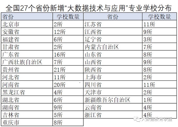全国27个省份新增“大数据技术与应用”专业学校分布: