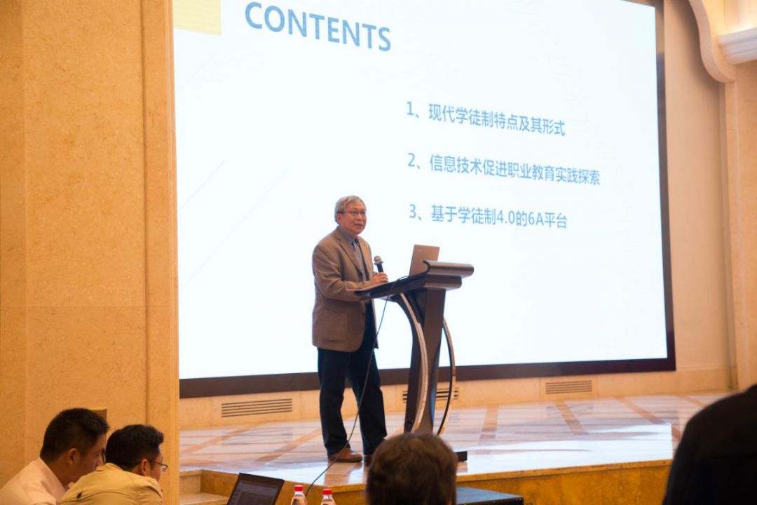 全国现代学徒制工作专家指导委员会主任、广东建设职业技术学院院长赵鹏飞做了题为《新一代信息技术专业现代学徒制探索与实践》的报告,介绍了现代学徒制特点及其形式,信息技术促进职业教育实践探索、基于学徒制4.0的6A平台等方面进行精彩分享,对中国特色现代学徒制试点工作方案、在现阶段推进实施现代学徒制的关键点、新时代对现代学徒制的新要求和新任务进行了全面解读。期间,还分享了我国各大院校中现代学徒制探索与发展案例。