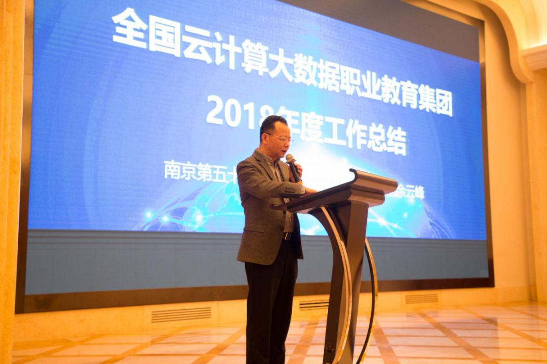 职教集团秘书长、南京第五十五所技术开发有限公司副总经理余云峰做《全国云计算大数据职业教育集团2018年度工作总结》。余云峰表示职教集团成立以来,进一步优化职教集团组织架构,加强集团成员间的沟通交流; 完善校企合作人才培养体系,创新人才培养模式; 在山东、重庆、江西、山西等地组织了一系列活动,激发了集团运行活力; 推动落实资源库建设和"1十X"证书认证等系列项目落地,提升了集团引领能力。2019年,职教集团将充分发挥集团工作的创造性,调动校企双方的积极性,把产教融合、校企合作推向纵深发展,大力推广"工匠工坊"人才培养模式,打造职教集团品牌,推动职教集团工作再上新台阶。