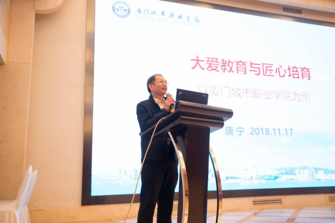 厦门城市职业技术学院院长唐宁做了题为《大爱教育与工匠精神培育》报告,介绍了厦门城市职业技术学院近年来的办学探索与实践,展示学校的办学成果与特色,表示学校开门办学,主动适应产业转型,转变校企合作理念和思路,主动适应供给侧结构性改革对现代职业教育的新要求,“因城而生,为市则活”,及时调整优化专业结构布局,秉承“大爱”教育理念,培养学生工匠精神,服务企业用工需求和学生成才需要。坚持以学生中心,培养一专多能复合型人才。