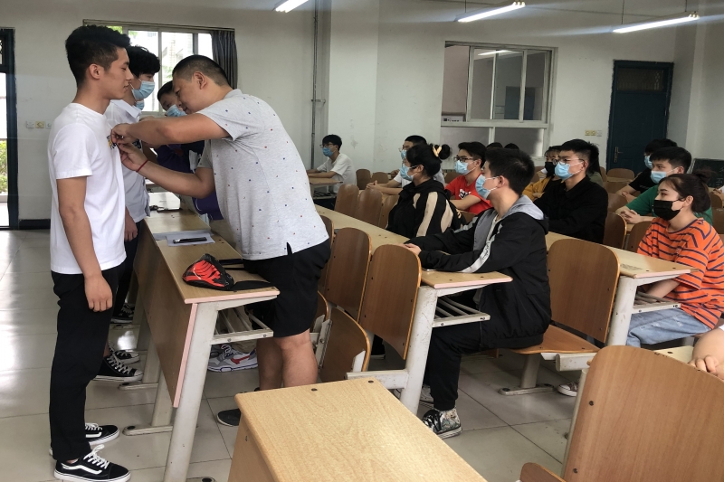 教师党员为新入党党员佩戴党员徽章,并诚恳勉励新党员努力学习争做贡献。
