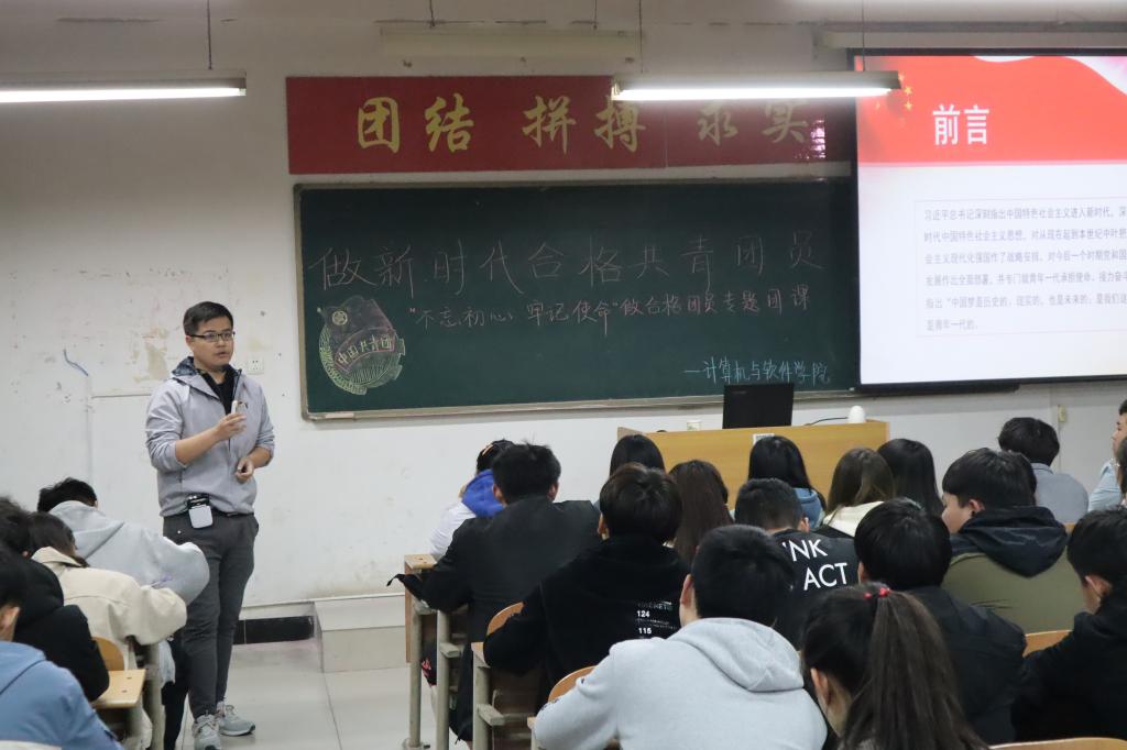 11月11日晚,计算机与软件学院团总支开展“不忘初心、牢记使命”做合格团员专题团课,各团支部书记、组织委员等116名团员代表参加团课学习,专题团课由计算机与软件学院团总支书记周睿主讲。