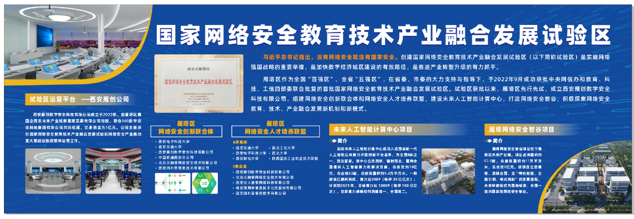 雁塔区委副书记、区长王建军表示,雁塔区作为全省首批创新型城区,高度重视数字经济发展,持续调动辖区39所大中专院校、55家省部级科研院所、67个重点实验室等资源,初步形成了“‘一个数据中心’归集、‘三园一圈’平台支撑”的发展格局,即:在西安市首家成立大数据服务中心,打通各领域、各行业数据交换通道,实现数据共治共享;辖区有交大科技园、西京科创园、未来产业城(园)及环小寨创研圈,有效整合创新链、产业链、资本链、人才链。其中,未来产业园中的网络安全和人工智能产业发展强劲,已布局联东U谷·网络安全产业园等项目,落地360集团等头部企业,成功跻身首批国家网络安全教育技术产业融合发展试验区,未来人工智能计算中心成功入选国家新一代人工智能公共算力开放创新平台。