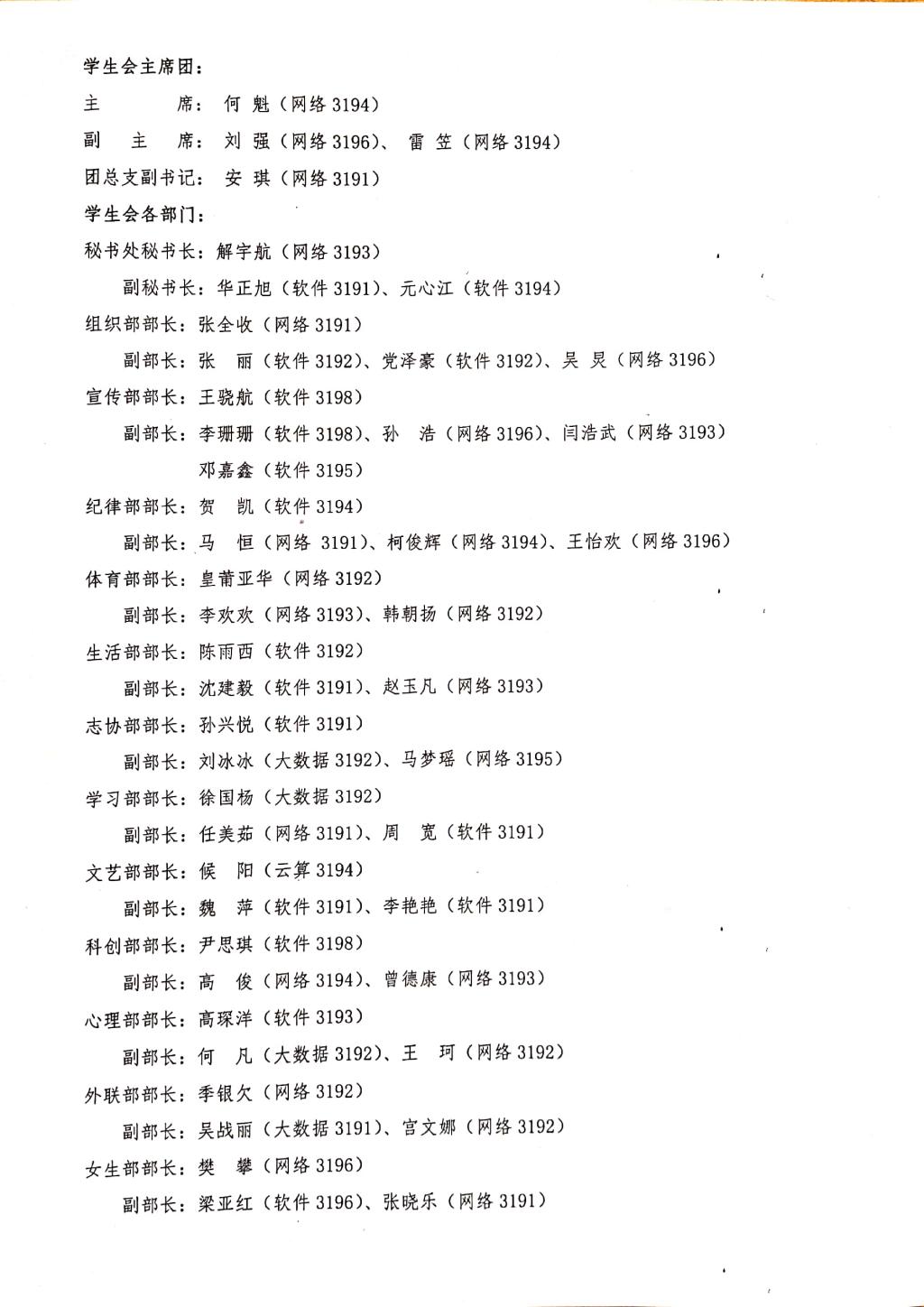 由学生本人申请,辅导员推荐,通过竞聘会面试、分院考察,经研究决定,拟聘任何魁等 47名学生为分院第四届学生会干部,现予以公示。公示时间: 2020年 9 月 12 日-9 月 16日,如有异议,可向计算机与软件学院新利体育官方网站办公室反映。