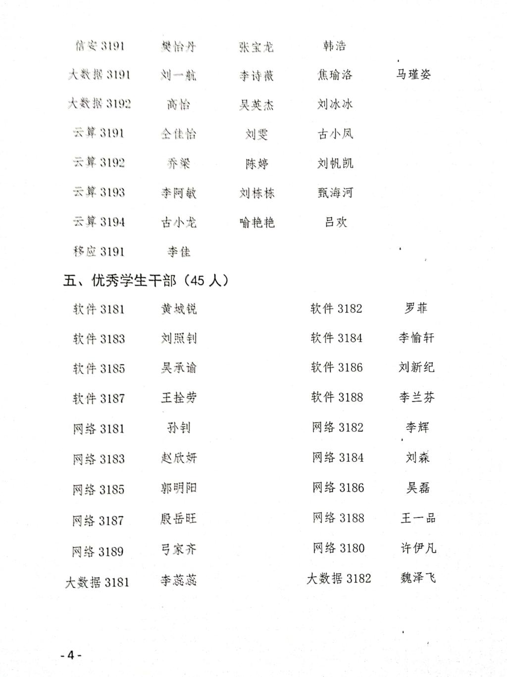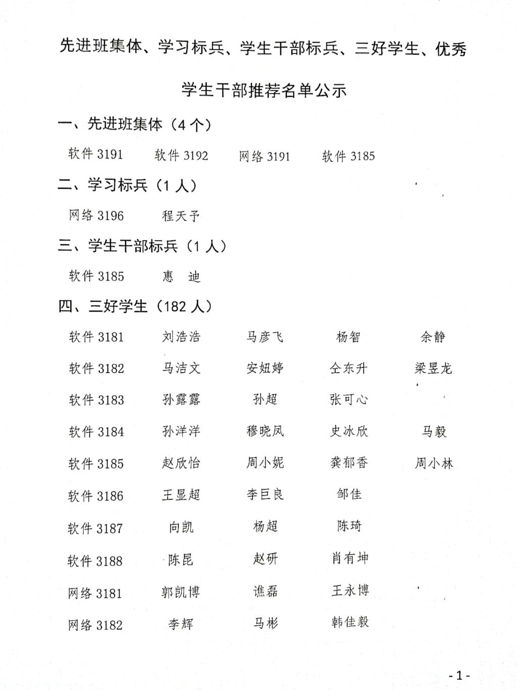 依据《18新利苹果客户端“学习标兵”、“学生干部标兵”、“三好学生”、“优秀学生干部”和“先进班集体”评选奖励办法》等相关文件要求,经过学生申请,结合班级推荐及民主评议意见,经研究决定,现将计算机与软件学院2019-2020学年先进班集体、学习标兵、学生干部标兵、三好学生、优秀学生干部推荐名单予以公示。公示时间为2020年9月23日至2020年9月25日。