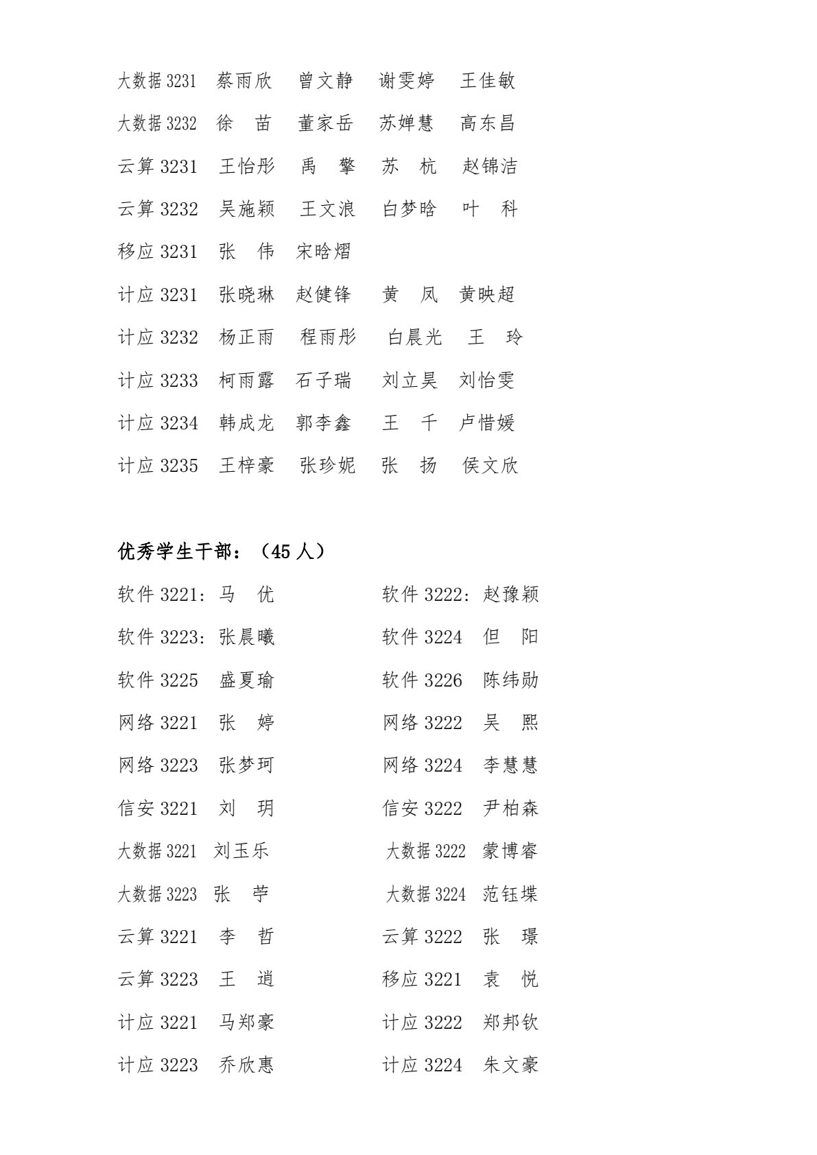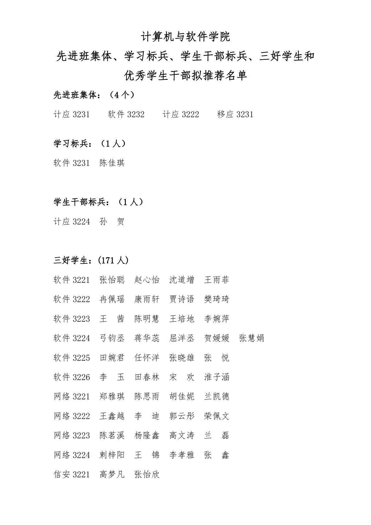 依据陕国职学工字〔2024〕33号《关于开展“学习标兵”、“学生干部标兵”、“三好学生”、“优秀学生干部”和“先进班集体”评选工作的通知》文件要求,经过学生申请,结合班级推荐及民主评议意见,经研究决定,现将计算机与软件学院2023-2024学年先进班集体、学习标兵、学生干部标兵、三好学生、优秀学生干部拟推荐名单予以公示。