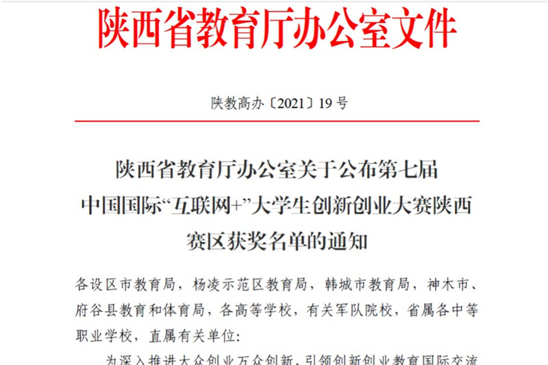 第七届中国国际“互联网+”大学生创新创业大赛陕西省级复赛已于7月31日-8月1日进行完毕。我校在本次陕西赛区省级复赛中共获得金奖12项、银奖12项、铜奖7项。其中在职教赛道荣获11项金奖、10项银奖、5项铜奖,“青年红色筑梦之旅”赛道荣获1项金奖,2项银奖、2项铜奖,学校荣获职教赛道集体奖。我校所获金奖数位居陕西高职院校第一,所推荐的参加陕西赛区省级复赛的31个项目全部获奖,获奖率百分之百。