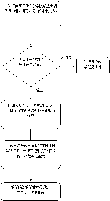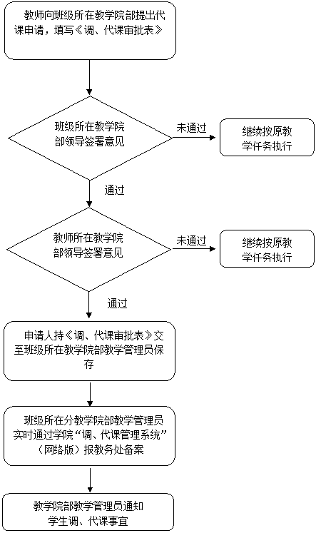 2.任课教师调、代课手续须提前一天办理,确因特殊原因不能按时办理,须在上课前通知上课学生并告知其所在教学院部教学管理员,事后及时补办手续。