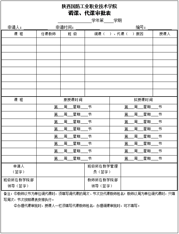 1.调、代课情况由任课教师填写《调、代课审批表》,按规定办理相关审批手续后,将《调、代课审批表》交至班级所在教学院部教学管理员处备案;
