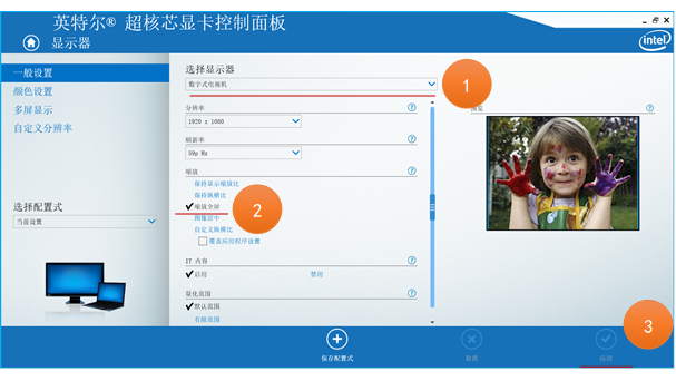 3、在“一般设置”界面中按步骤选择选择显示器”>>“数字式电视剧“>>”缩放全屏“,然后单击“应用”确认。