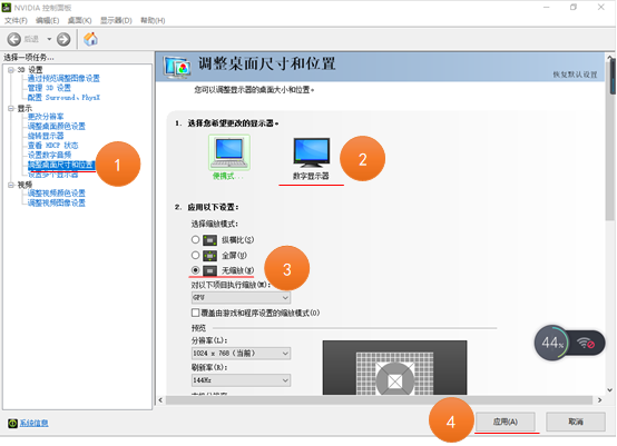 2、在设置窗口按步骤选择调整桌面尺寸和位置”>>“数字显示器“>>”无缩放“,然后单击“应用”确认。