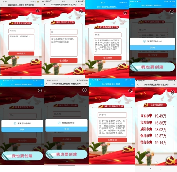 活动以缅怀、追思、传承为主要思想,各教师党员和学生党员以及所有积极分子在网上通过向革命先烈敬献鲜花、书写寄语的方式,深刻缅怀所有革命先烈的丰功伟绩,表达对革命先烈的敬仰之情和继承发扬革命先烈遗志的坚定决心。