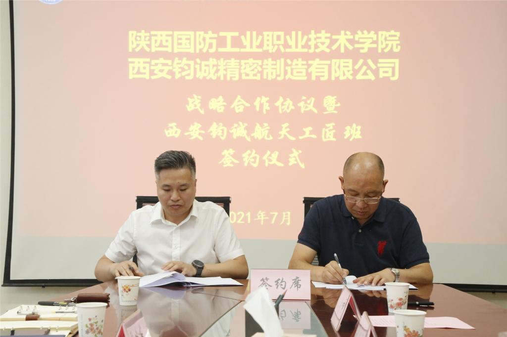 刘少阳副校长和贾建东副总经理代表校企双方,签订校企合作战略协议,张俊勇处长与王艳红部长代表双方签署“西安钧诚航天工匠班”人才培养协议。
