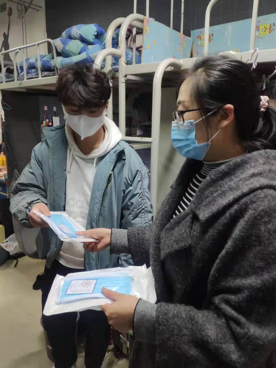一、慷慨解囊,共渡难关。机械工程学院任焊接3201班和模具3201班临时班主任的胡娜老师在走访、慰问学生的过程中,听说学生把学校发的口罩快用完的情况下,慷慨拿出自己家里的口罩,发给学生每人一包。在物资紧张的当下,胡老师把学生需求放在第一位,不计个人利益,真正体现了以学生为中心。