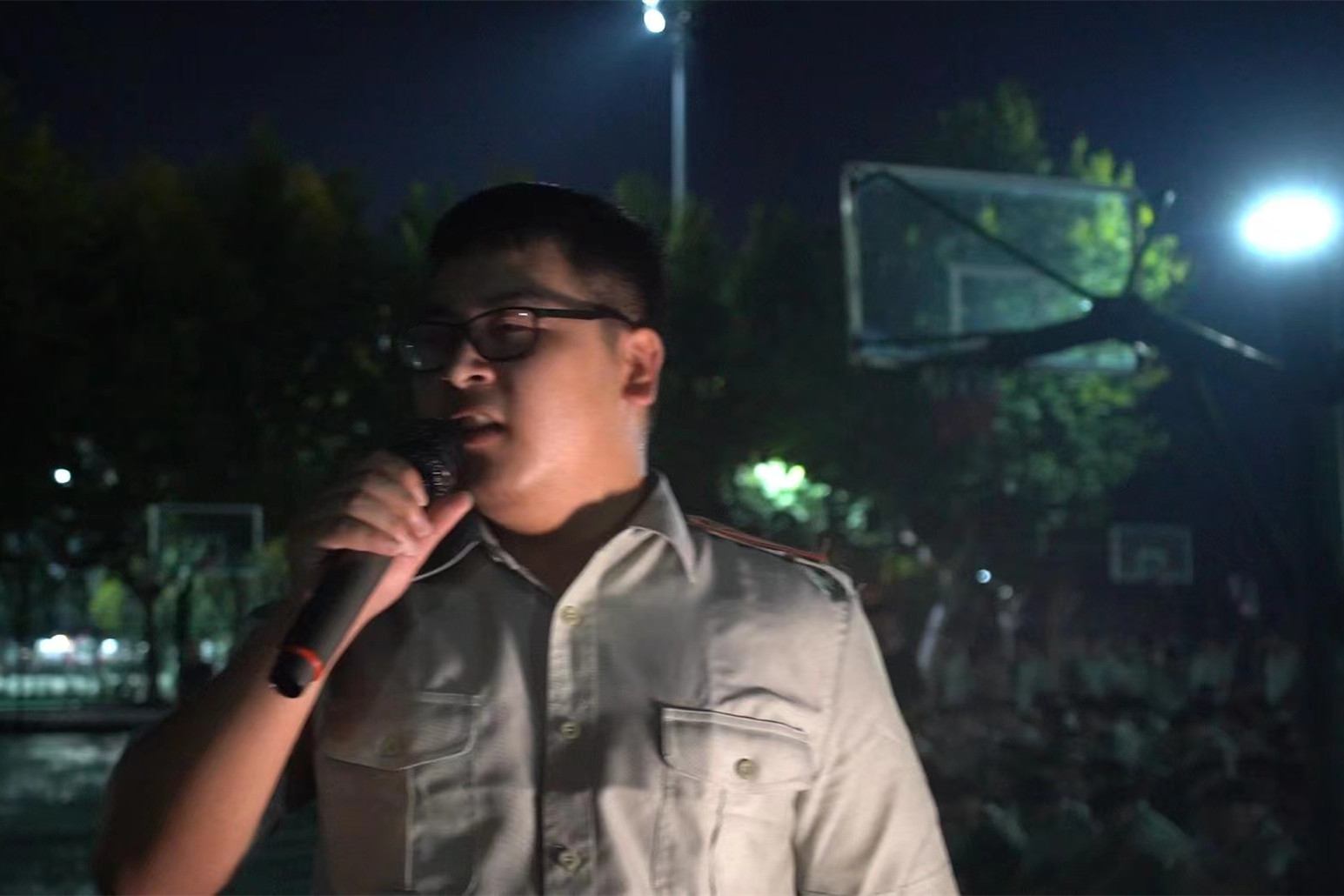 暮色降临,军训学生在教官的带领下汇集在篮球场上