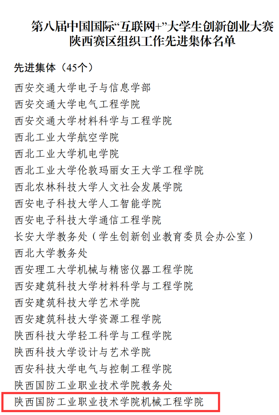 近日,陕西省教育厅表彰了第八届中国国际“互联网+”大学生创新创业大赛陕西赛区组织工作先进集体和先进个人,我校机械工程学院获得陕西赛区组织工作先进集体。本次大赛共表彰包括西安交通大学电子与信息学部在内的先进集体共45个。