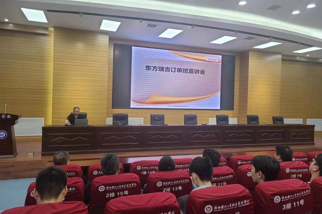 首先,郭力介绍了江苏东方瑞吉能源装备有限公司的基本情况、订单班的培养模式以及后续安排,又从人生规划、职业发展、就业选择等方面对参会同学进行了动员。随后,东方瑞吉公司人事经理杨昌宏详细通过介绍了企业的发展与文化、公司产品与发展规划、薪资待遇与福利补贴、人才培养与晋级通道及员工生活与保障等。