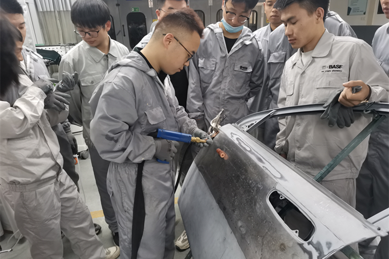 活动过程中,同学们还展示了自己对汽车板件维修精湛的技艺,如宋宇航同学对车辆门板进行钣金修复,通过植入介子片将受损门板的平整度修复到标准要求。