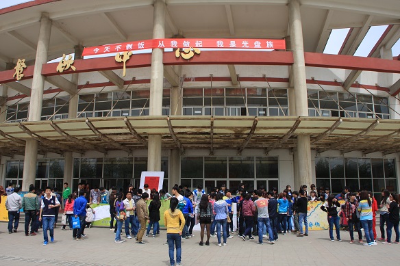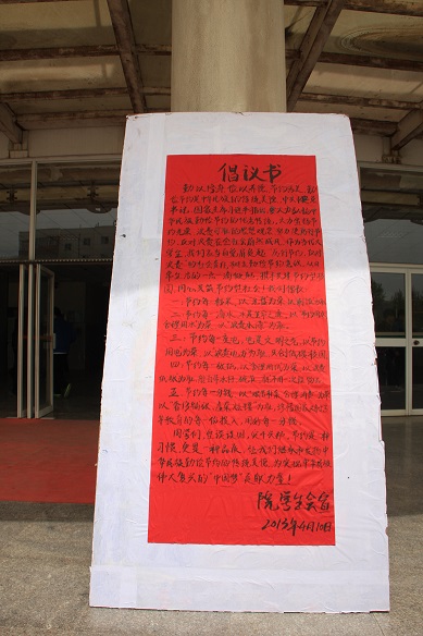 2013年4月12日中午,由院学生会组织,各分院学生会干部积极参与,在北校区餐饮中心门前举行了“厉行节约、反对浪费”倡议签名活动。