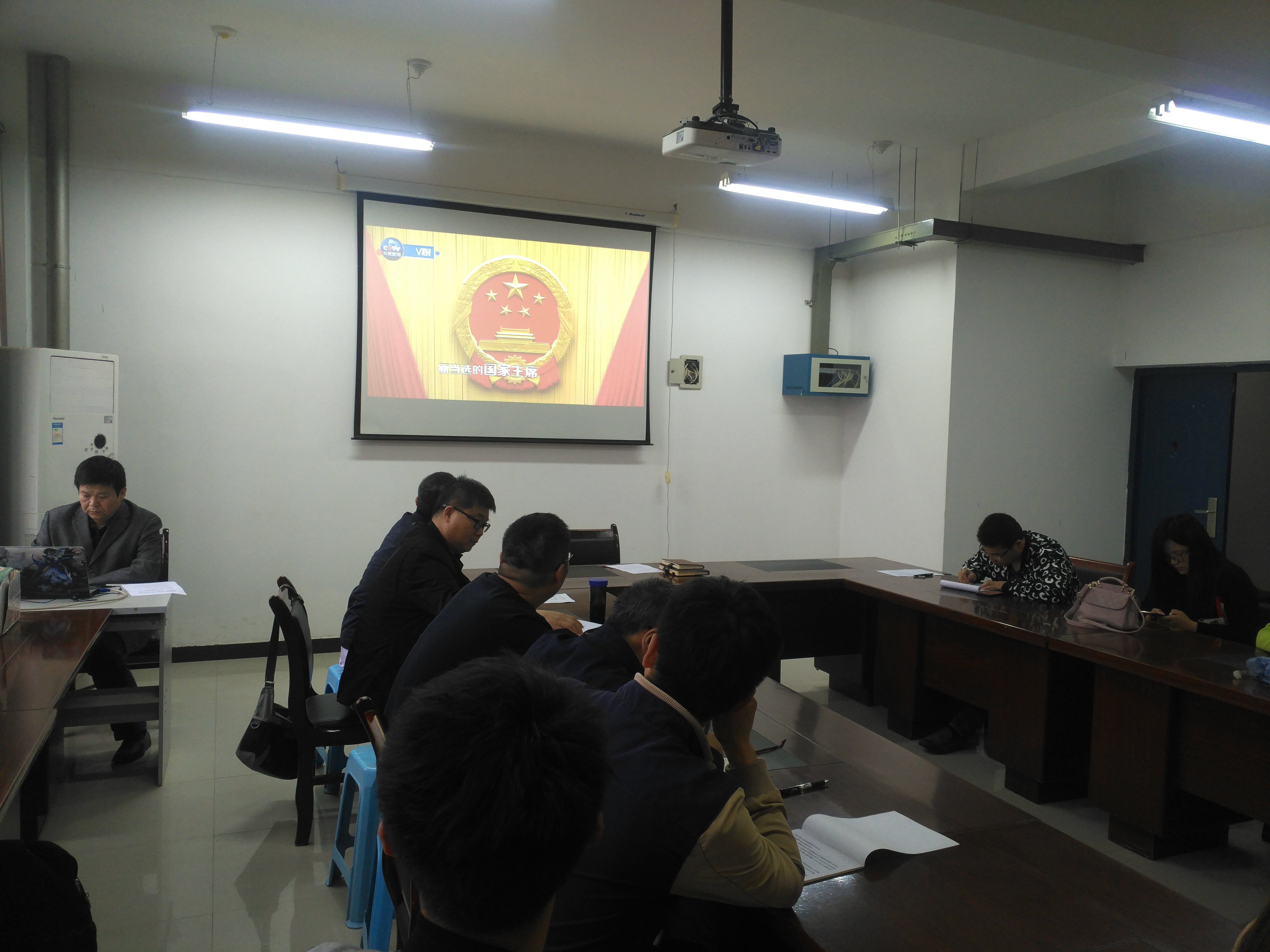 在学院党总支书记史朝辉的指导下,全体教职工学习了2018年《政府工作报告》全文、《得民心众望所归齐奋斗再创辉煌—社会各界热烈拥护习近平当选国家主席、中央军委主席》全文、视频《解读政府工作报告》、视频《中国共产党第十九届中央委员会第三次全体会议公报》等内容。