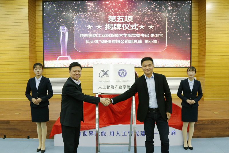 学校党委书记张卫平、科大讯飞副总裁彭小露共同为全国首家人工智能产业学院揭牌。