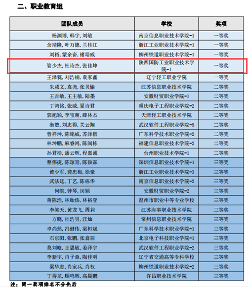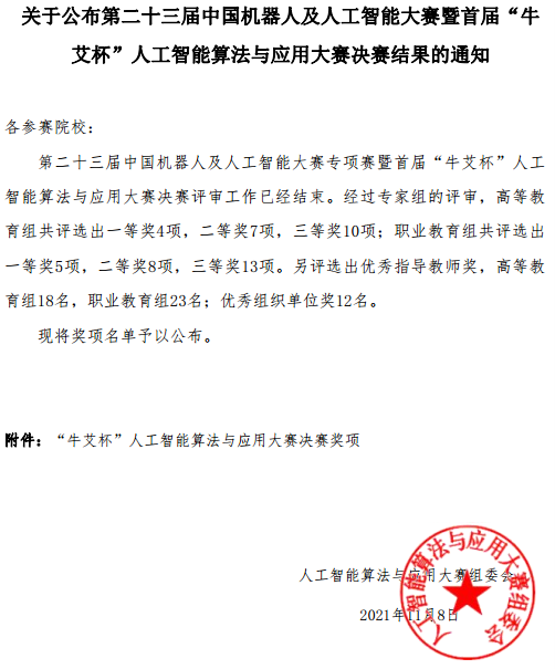 由教育部指导、中国人工智能学会主办的第二十三届中国机器人及人工智能大赛暨首届“牛艾杯”人工智能算法与应用大赛决赛于11月6日在线上成功举办,经过各省级选拔赛、全国初赛后,来自全国28个省(市)、自治区的86支代表队参加了全国决赛,经过激烈角逐,我校人工智能学院管少杰、杜诗杰、张佳坤三位同学组成的代表队荣获全国一等奖(全国仅有5所高职院校获得一等奖),我校荣获优秀组织单位奖,两位指导教师李研伟、石宝刚荣获优秀指导教师。