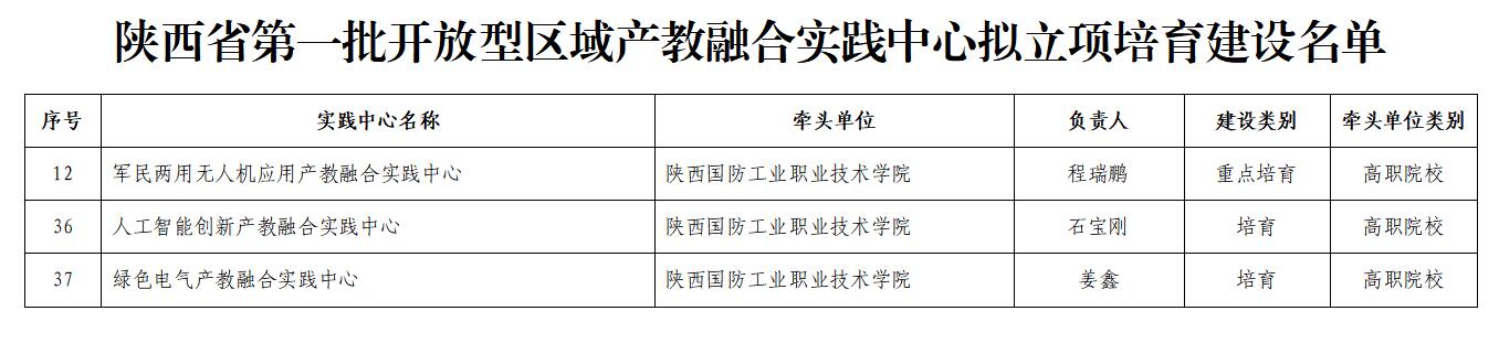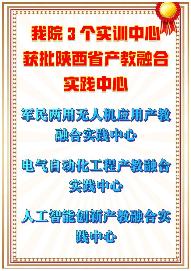 根据陕西省教育厅文件,我院“军民两用无人机应用产教融合实践中心”、“电气自动化工程产教融合实践中心”、“人工智能创新产教融合实践中心”3个中心获批陕西省第一批开放型产教融合实践中心。根据陕西省人力资源和社会保障厅文件,我院“物联网安装调试”、“服务机器人应用技术”、“工业互联网工程技术”3个实训基地获批陕西省集训基地。