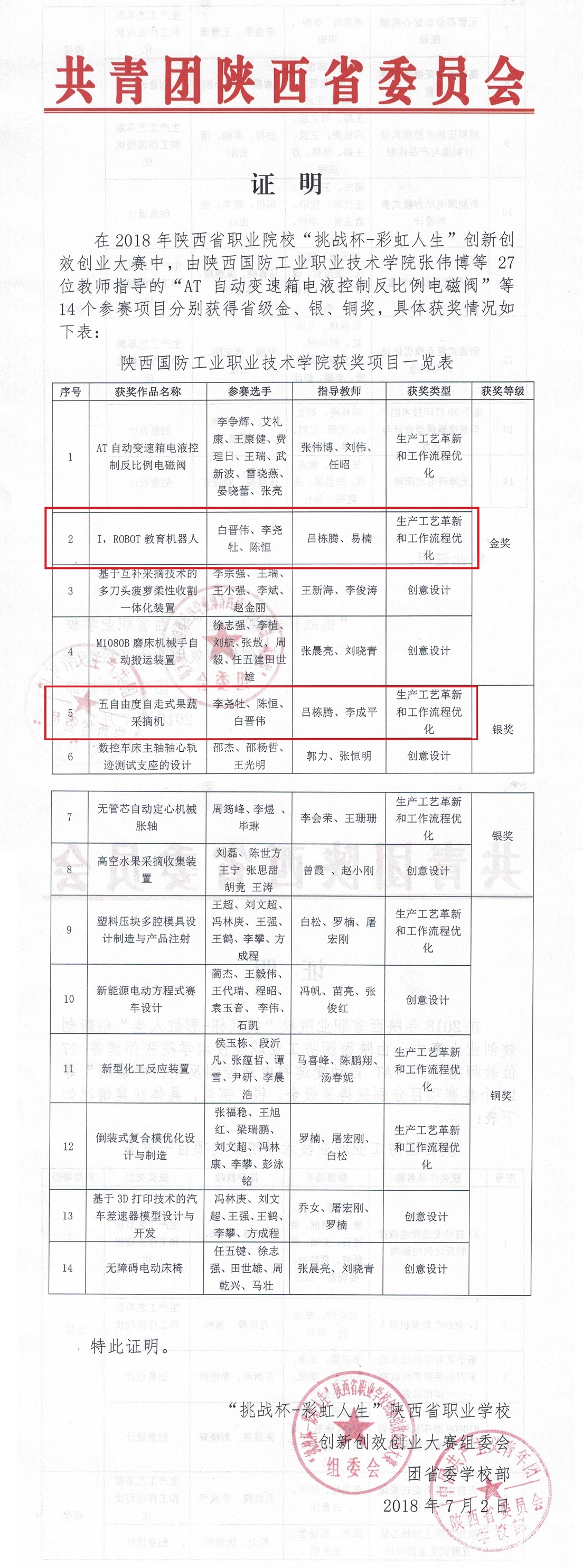 在2018年陕西省职业院校“挑战杯-彩虹人生”创新创效创业大赛中,我院参赛项目“I,ROBOT教育机器人”获省级金奖,“五自由度自走式果蔬采摘机”获省级银奖。