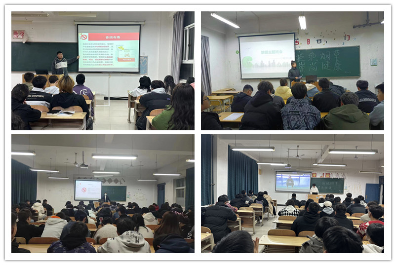 班会上,各班辅导员和班委结合视频、PPT等形式向学生讲解了烟草成瘾带来的危害的相关内容,让大家充分认识到烟草对人类健康的危害。通过多媒体介绍香烟的相关知识,重点强调了吸二手烟对我们健康的危害,倡导同学们树立“拒绝吸第一支烟,不成为新烟民”的观念,提升同学们禁烟控烟意识。紧接着各班通过吸烟前和吸烟后对身体损伤的相关图片,介绍了吸烟会导致许多疾病,包括肺癌、心脏病、中风、慢性支气管炎等。最后,各班针对学生爱美的特点指出,吸烟并不是一种很“酷”的行为,吸烟会影响人的外貌,使皮肤变得暗黄、干燥,牙齿变黄,口臭等等。同学们学习到了有关吸烟的知识,深刻地认识到烟草的危害,意识到珍惜生命的重要性,纷纷表示要坚守健康生活方式,远离烟草,珍爱生命,高质量、健康美好地生活。