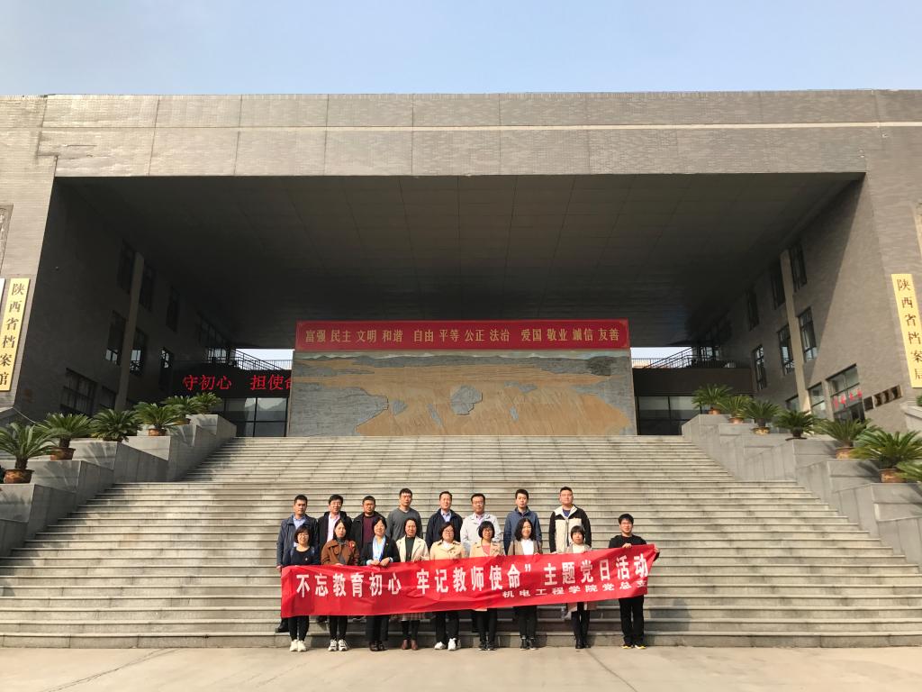 10月23日下午,机电工程学院党总支组织全体教工党员前往陕西省档案馆,开展“不忘教育初心、牢记教师使命”主题党日活动,参观了不忘初心牢记使命主题教育档案文献展馆和黄河在咆哮——抗战中的陕西展馆,从文献和历史中深切感悟共产党人为中国人民谋幸福、为中华民族谋复兴的初心和使命。