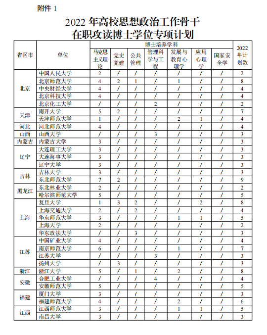 现将教育部办公厅《关于做好2022年高校思想政治工作骨干在职攻读博士学位专项计划工作的通知》(教思政厅函〔2022〕1号)转给你们,并就做好我省今年招考工作通知如下: