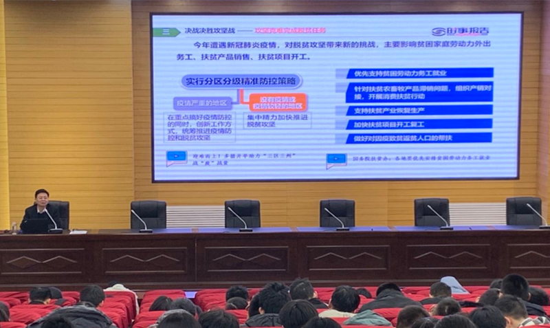 为了让同学们认识到“三农”问题之于全面建成小康社会的重要性以及如何补齐“三农”短板的中国智慧,张卫平书记以《补上全面小康“三农”短板》为题,从农业农村的发展变化 、对标对表补齐短板、决战决胜脱贫攻坚三个方面通过自己真实的感受,现实生活中典型案例解读以及大量数据的对比分析,进行了全面而细致的讲述。他强调,全面建成小康社会是中华民族的千年梦想,是中国共产党的初心和使命,更是党给人民的庄严承诺,今年是全面建成小康社会目标实现之年,也是全面打赢脱贫攻坚战的收官之年,“三农”问题是全面建成小康社会的重要内容,补齐“三农”短板是关键环节。