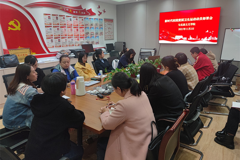 为贯彻落实习近平总书记关于深入开展新时代爱国卫生运动的重要讲话精神,传达落实学校相关部署安排,马克思主义学院于2021年11月2日下午,在9-705召开了新时代校园爱国卫生运动动员部署会,会议由吴娟院长主持,马院全体专职教师参加。