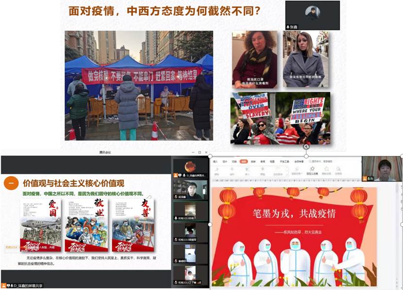 在这个特殊的时期,为了将高校思想政治理论课教学优势转化为支持防疫斗争的强大力量,引导广大学生增强“四个意识”、坚定“四个自信”、做到“两个维护”,深刻认识中国抗疫彰显的中国共产党领导和中国特色社会主义制度的显著优势,马克思主义学院教师结合现阶段疫情防控要求,通过线上教学,紧贴时代主题,聚焦社会热点,回答学生关切,提升亲和力和针对性,把思想引导、知识引导、心理引导、舆论引导落到实处。