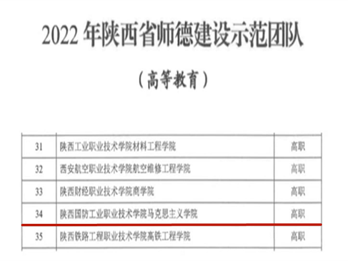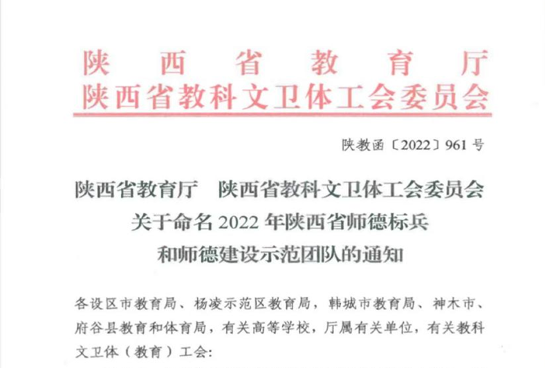 2022年5月,陕西省教育厅、陕西省教科文卫体工会委员会发布了《关于遴选2022年师德标兵和师德建设示范团队的通知》。根据通知精神,马克思主义学院严格遴选范围,对标申报条件,积极筹备各项准备工作。经学校上报、专家组材料评审、各级教育行政部门、教育工会组织和高校逐级遴选,陕西省各高校代表团队中共确定了80个单位为“陕西省师德建设示范团队”,我院入选数列位于陕西高职院校前列。