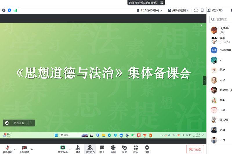 本次备课会由李航老师围绕《思想道德与法治》教材中以“担当复兴大任 成就时代新人”为主题的绪论部分进行授课思路讲解。李航老师指出,绪论部分需要着重讲述清楚两部分内容。一是带领大一新生充分认识大学生活,引导大一新生了解大学生活对人生的意义、作用以及主要任务,为新生过好大学生活提供思想指引;二是围绕“新时代是一个什么样的时代、为什么说中国社会进入了新时代以及新时代对青年大大学生提出了怎样的要求”三个核心问题帮助大学生理解自身所处在新时代,同时引导大学新生认识到自身的青春梦与中国梦之间的联系,激励大一新生能够珍惜大学时光,努力学习,自觉成长为能够担当民族复兴大任的时代新人。