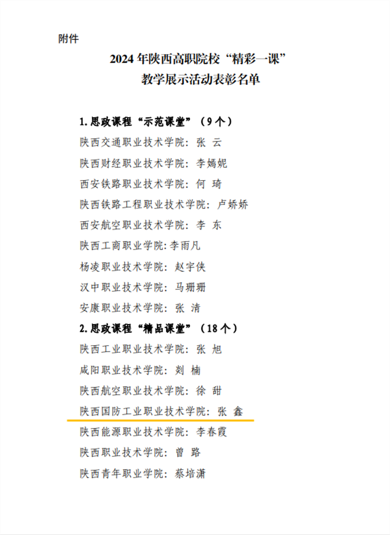 4月18日,陕西高职院校“大思政课”建设协同发展联盟公布了2024年陕西高职院校“精彩一课”教学展示活动表彰结果,我校马克思主义学院思政课教师张鑫获得“精品课堂”奖项。