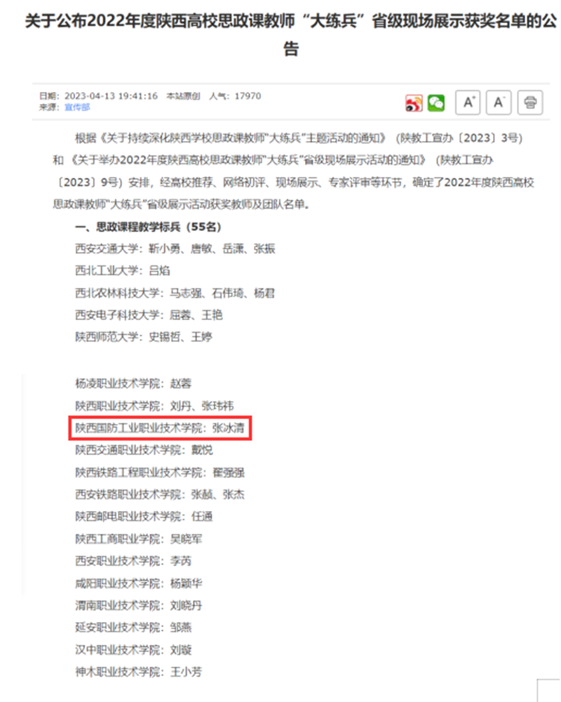 由中共陕西省委教育工委、陕西省教育厅组织的2022年度陕西高校思政课教师“大练兵”省级现场展示活动4月12日在西安交通大学举行。经现场展示、专家评审,今日公布了获奖教师及团队名单。马院张冰清老师脱颖而出,获得思政课程“教学标兵”荣誉称号。