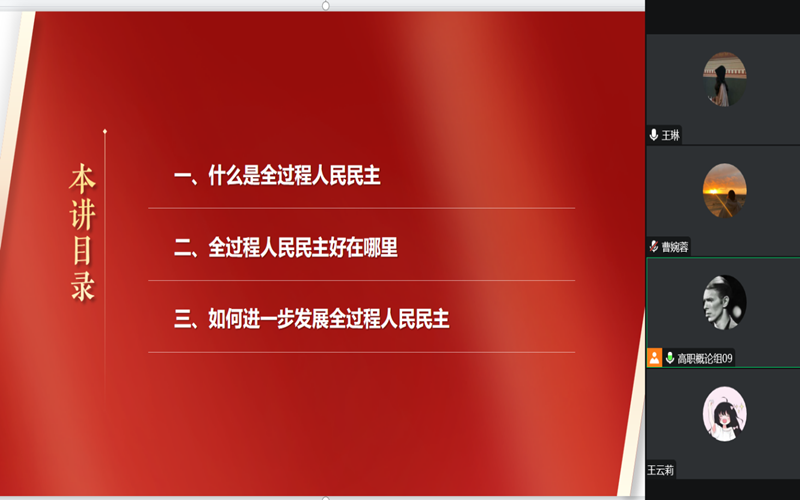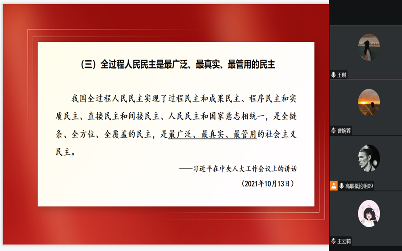 本次集体备课以“全过程人民民主”为主题。围绕着“什么是全过程人民民主”、“全过程人民民主好在哪里”两部分内容展开。结合我校第九次学生代表大会的民主选举内容,陈述了民主的概念,厘清了“中国式民主”与“资本主义民主”的不同之处,以大量的事例说明了“全过程”的完整制度程序与完整的参与实践,强调“全过程人民民主”是最广泛、最真实、最管用的民主,是我国民主政治的本质。