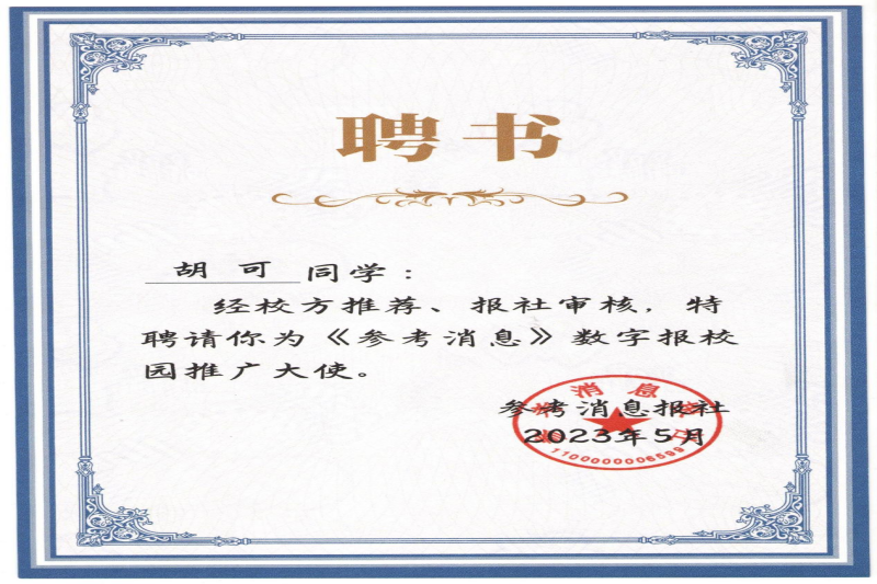 在备课会上,我校胡可同学同时被聘为《参考消息》数字报校园推广大使。