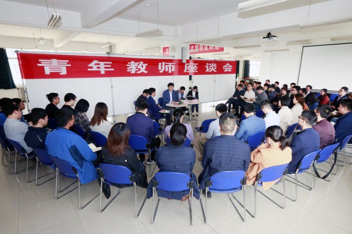 为更好地倾听青年教师的心声,了解青年教师思想、工作状况,助力青年教师快速成长。我校分别于4月9日、11日召开专职青年教师座谈会和兼职青年教师座谈会,座谈会在招生就业处宣讲厅举行。院长刘敏涵出席座谈会,党政办主任张鹏、人事处处长侯晓方、教务处处长罗继军、副处长张俊勇、团委书记易楠、教师发展中心主任胥航军及全体青年教师参加了座谈会。