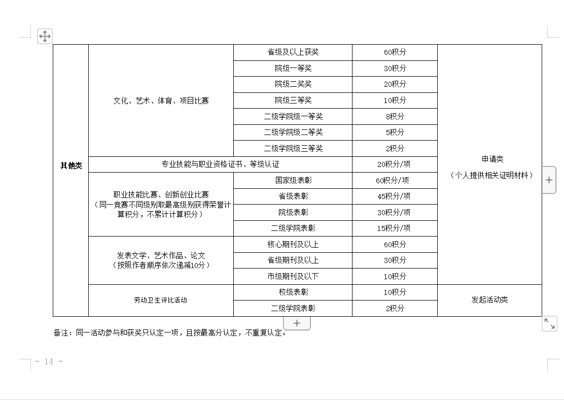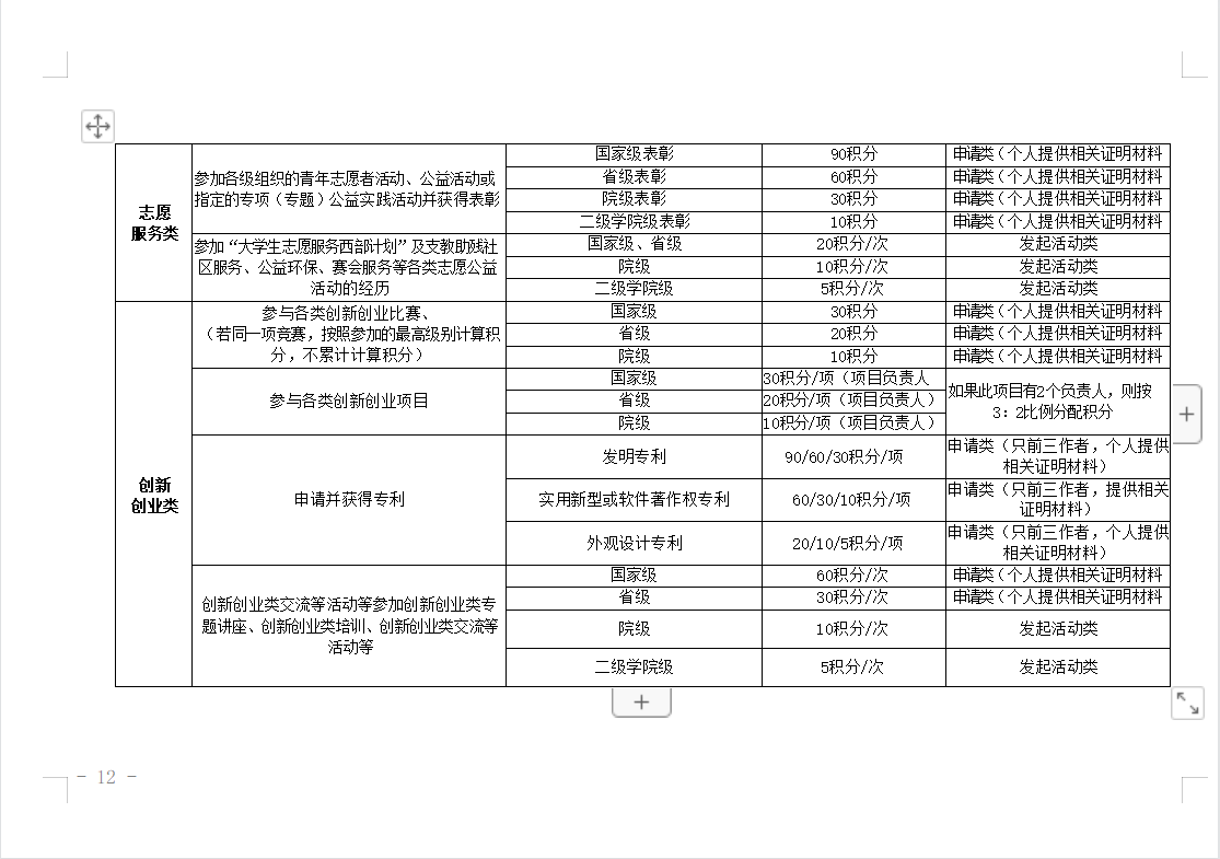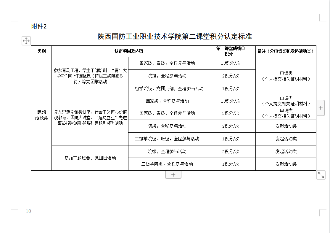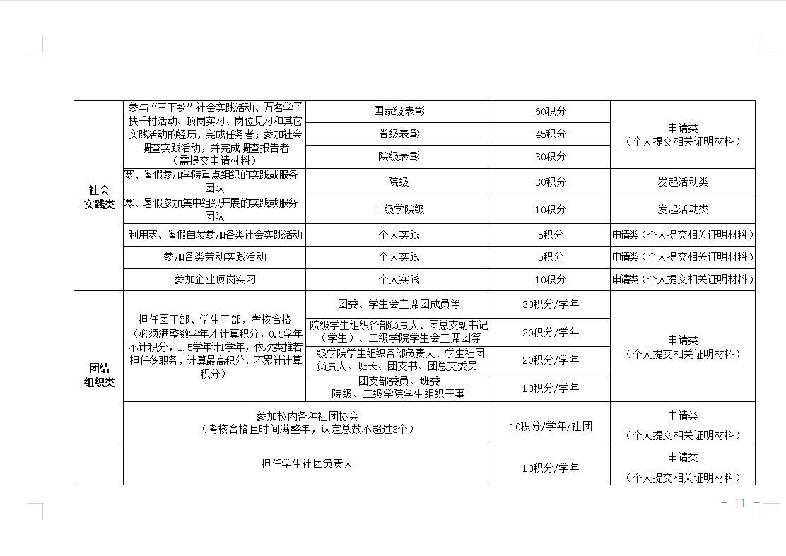 第十条 原则上第一学年、第二学年社会实践类或团结组织类不少于10积分,志愿服务类不少于10积分,文体活动类不少于10积分,创新创业类不少于10积分;第三学年除“思想成长类”模块外,其他模块修满不少于10积分。因学生长期参加职业技能大赛等集训,需修满总的最低积分要求,对以上模块最低积分可不做要求。