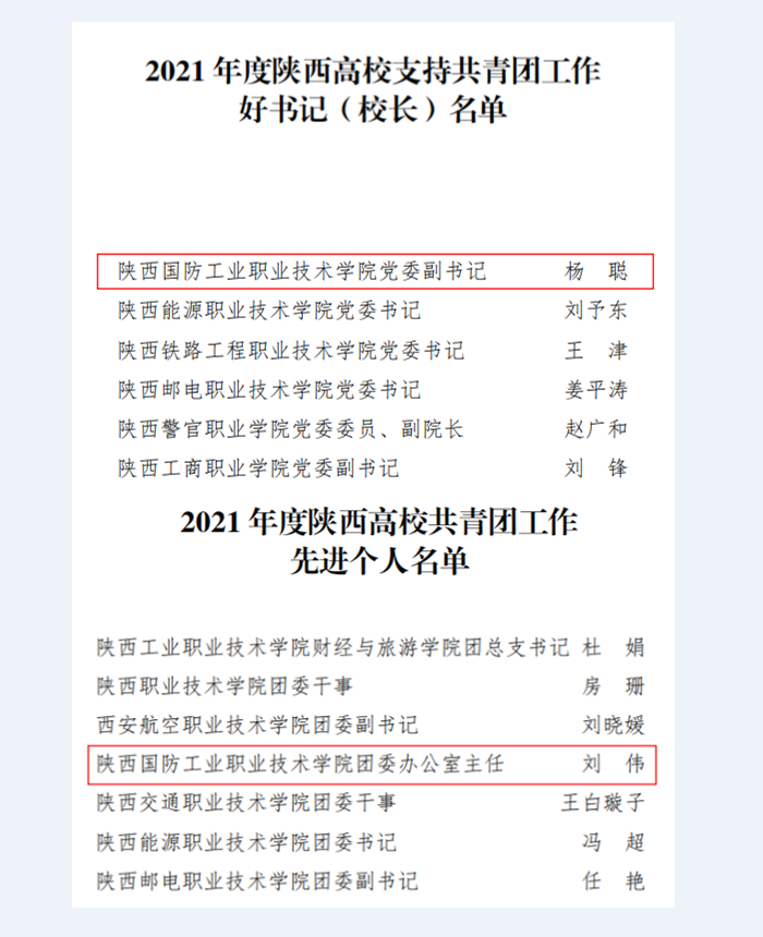 近日,共青团陕西省委、中共陕西省委教育工委下发了《关于2021年度陕西高校共青团述职评议考核结果的通报》文件,我校荣获“2021年度陕西高校共青团工作优秀单位”,党委副书记杨聪获得“2021年度陕西高校支持共青团工作好书记”称号,校团委刘伟荣获“2021年度陕西高校共青团工作先进个人”荣誉称号。