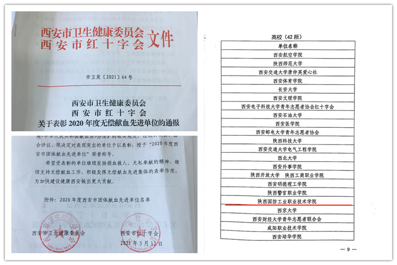 近日,西安市卫生健康委员会、西安市红十字会下发了《关于表彰2020年度无偿献血先进单位的通报》,我校荣获“2020年度西安市团体献血先进单位”荣誉称号。
