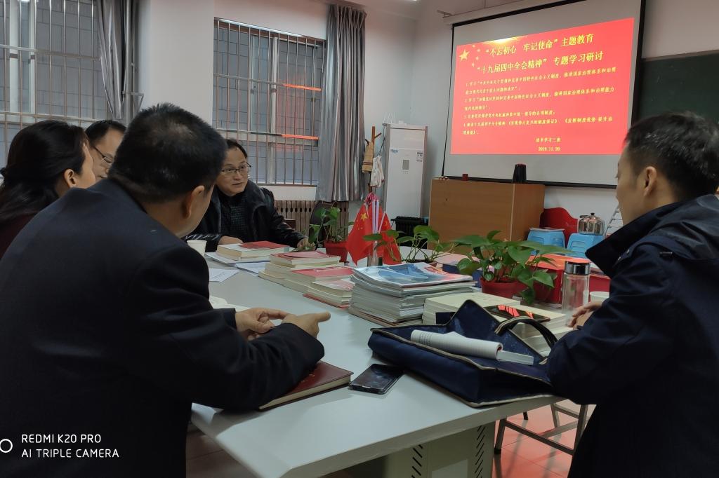 领学了《中共中央关于坚持和完善中国特色社会主义制度、推进国家治理体系和治理能力现代化若干重大问题的决定》、《加强党对坚持和完善中国特色社会主义制度、推进国家治理体系和治理能力现代化的领导》、《完善坚定维护党中央权威和集中统一领导的各项制度》。观看了专家对十九届四中全会精神解读《实现伟大复兴的制度保证》、《发挥制度优势 提升治理效能》。最后对十九届四中全会精神展开了热烈讨论。