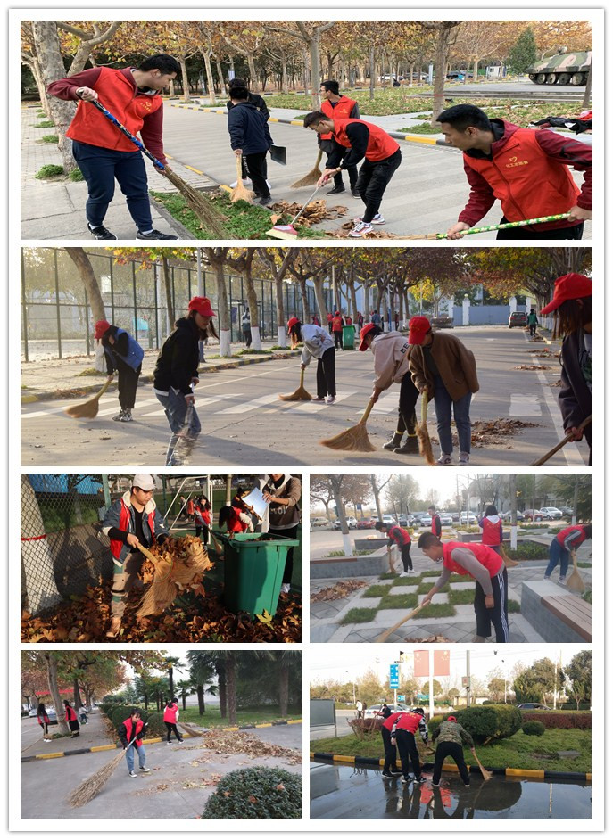 组织学员以分院为单位,在全校范围内开展“环保卫士”校园志愿服务活动,对校园落叶进行大清理,为学校建设“美丽校园”奉献自己的一份力量。