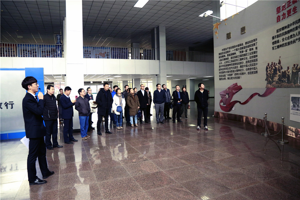 纪委书记王明哲代表学校对到访人员不畏严寒,莅临我校参观学习表示感谢,并着重介绍了学校的总体概况及办学特色。之后在讲解员的带领下,他陪同到访人员依次参观了军工文化墙、国防科技展馆和戴姆勒基地。参观过程中,通过先进武器装备展品、照片和校企合作教学的展示,不仅让到访人员了解到国家国防事业的发展历程和取得的伟大成就,也进一步展示了学校全方位、深层次、重实效的校企合作示范典型。