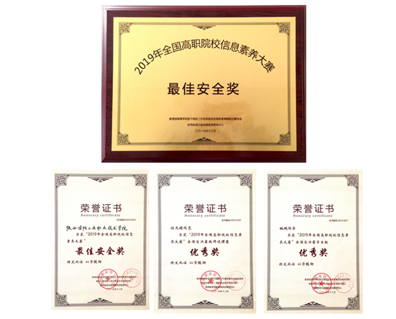 2019年12月4日至6日,我校教师任天娟、学生姚鹏作为陕西省唯一一组教师和学生,赴深圳参加全国首届高职院校信息素养大赛全国总决赛的现场比拼。来自全国20个省市的100名学生与20名教师,进行最后的角逐。经过现场知识与速度、能力与表现的比拼,我校学生姚鹏、教师任天娟双双获得优秀奖,我校也因组织得力,信息安全到位,综合能力突出,成绩显著,荣获“最佳安全奖”。