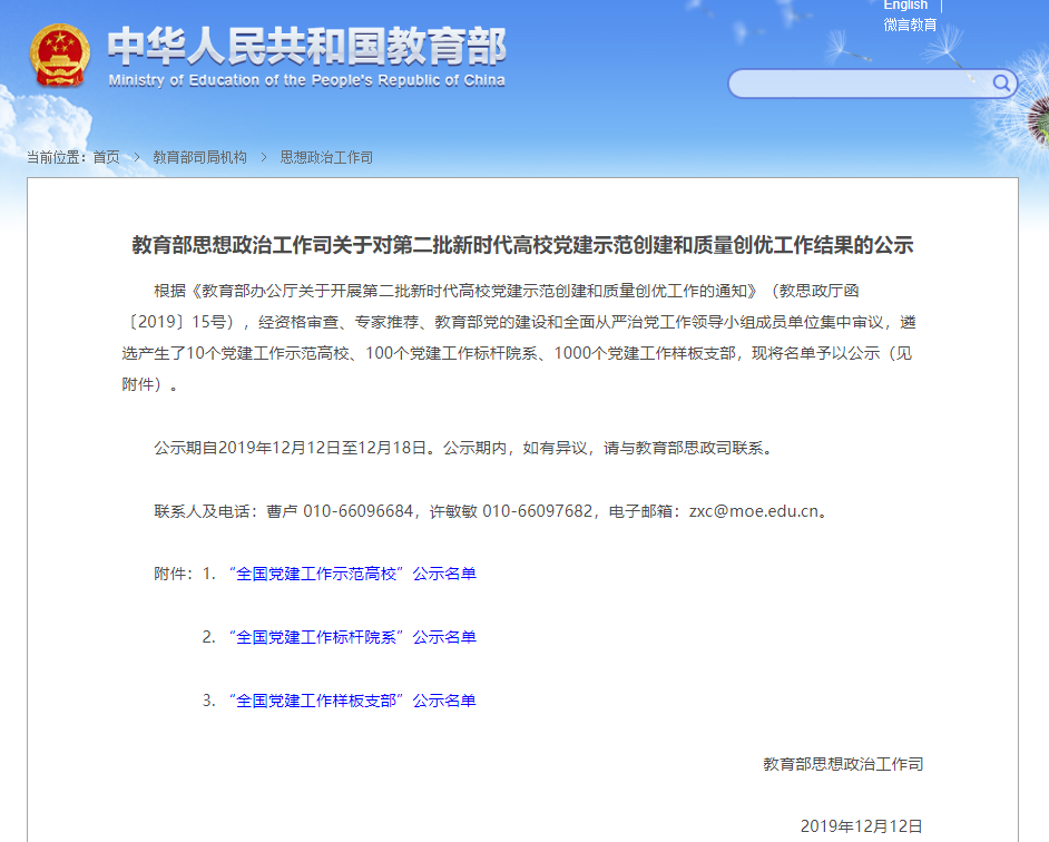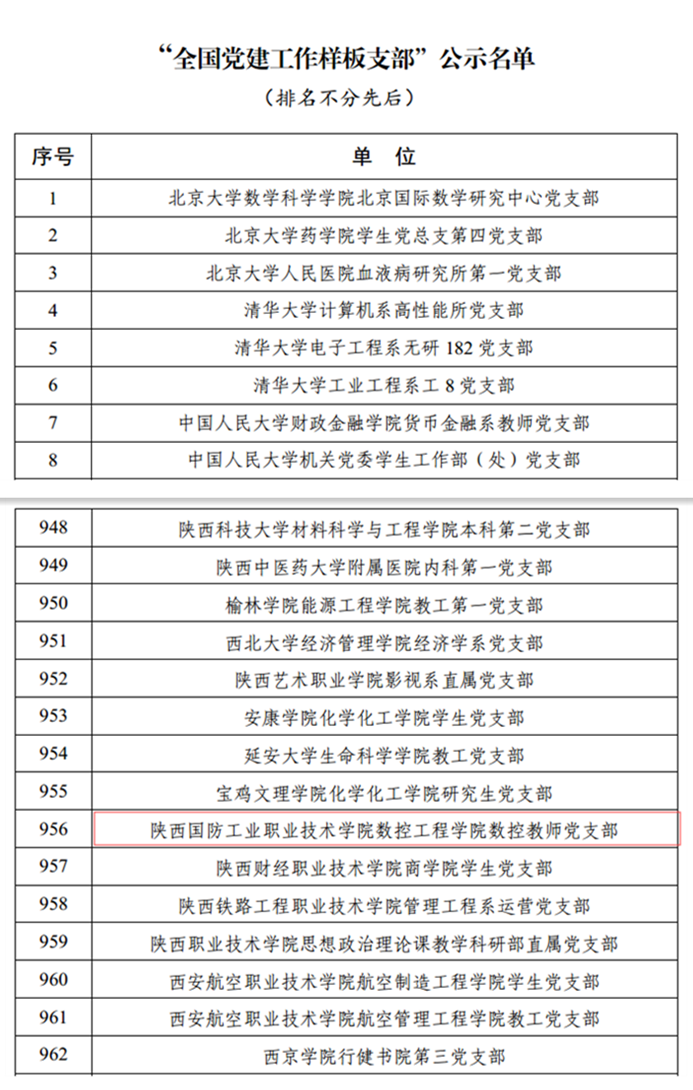 根据《教育部办公厅关于开展第二批新时代高校党建示范创建和质量创优工作的通知》(教思政厅函〔2019〕15号),经资格审查、专家推荐、教育部党的建设和全面从严治党工作领导小组成员单位集中审议,遴选产生了10个党建工作示范高校、100个党建工作标杆院系、1000个党建工作样板支部。我校数控教师党支部荣获全国党建工作样板支部。